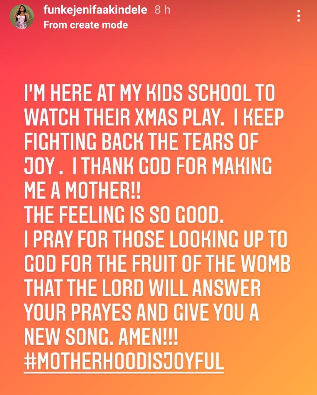 Funke Akindele has thanked God for making her a mother after visiting her kids’ school, and she also said a prayer for those seeking the fruit of the womb.