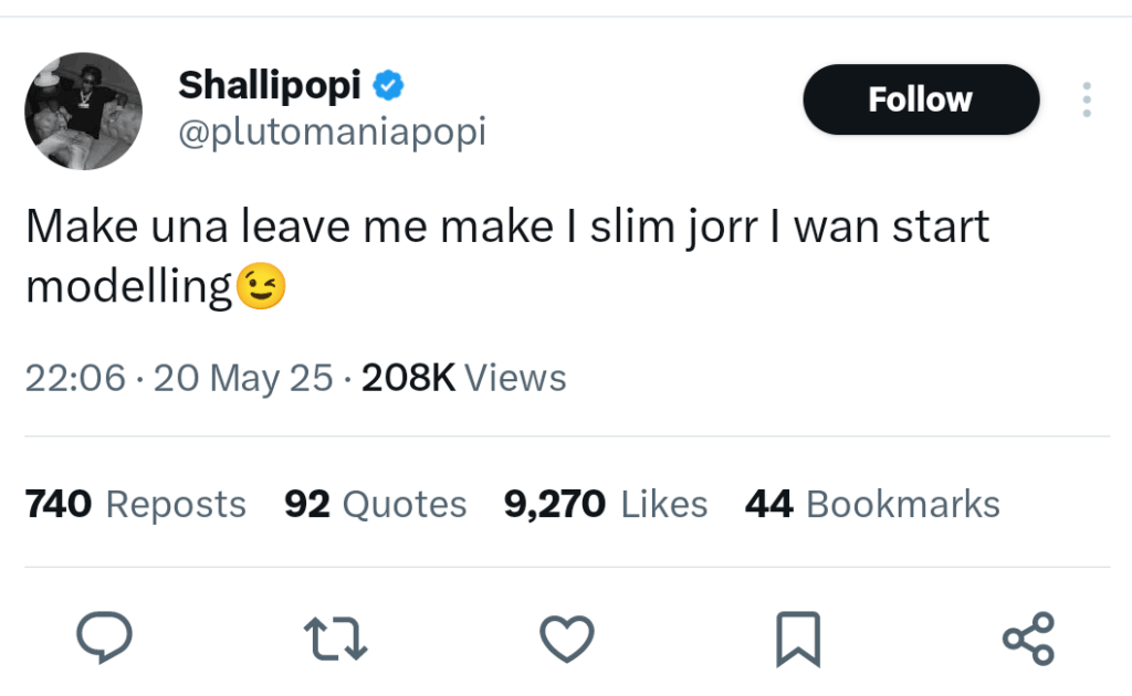 But in true Shallipopi style, the singer took to his verified X (formerly Twitter) page to set the record straight. According to him, the transformation is intentional — he’s slimming down for a new venture into the modelling world.