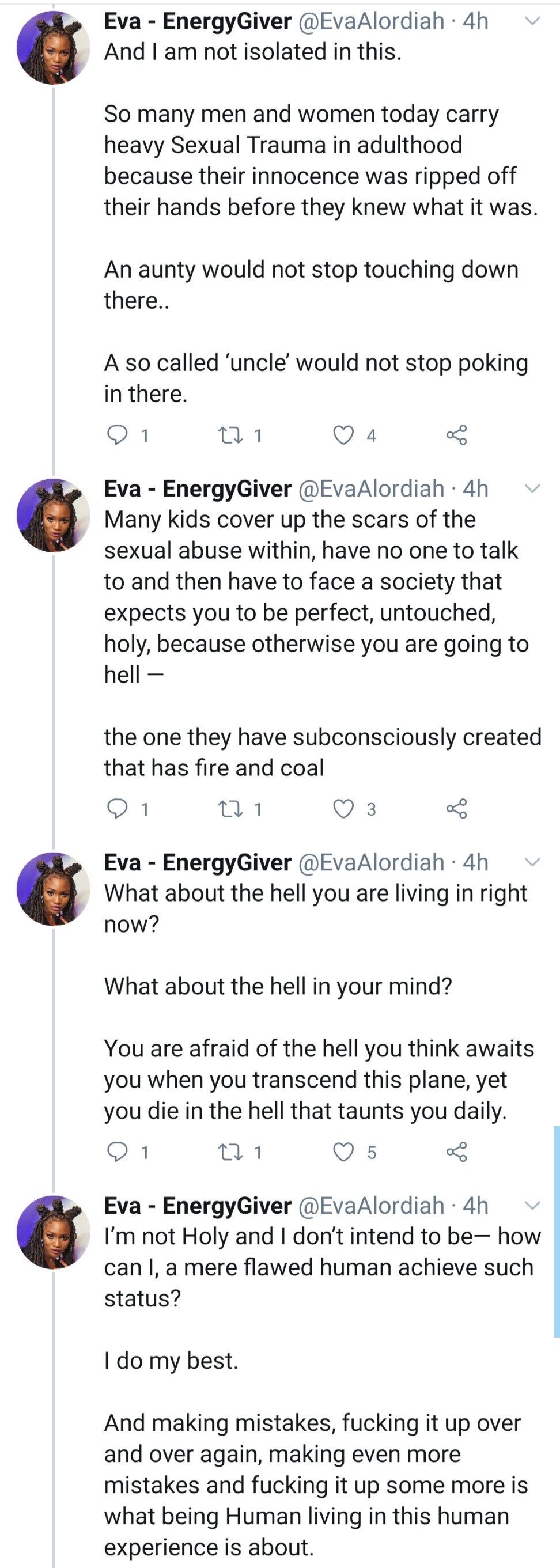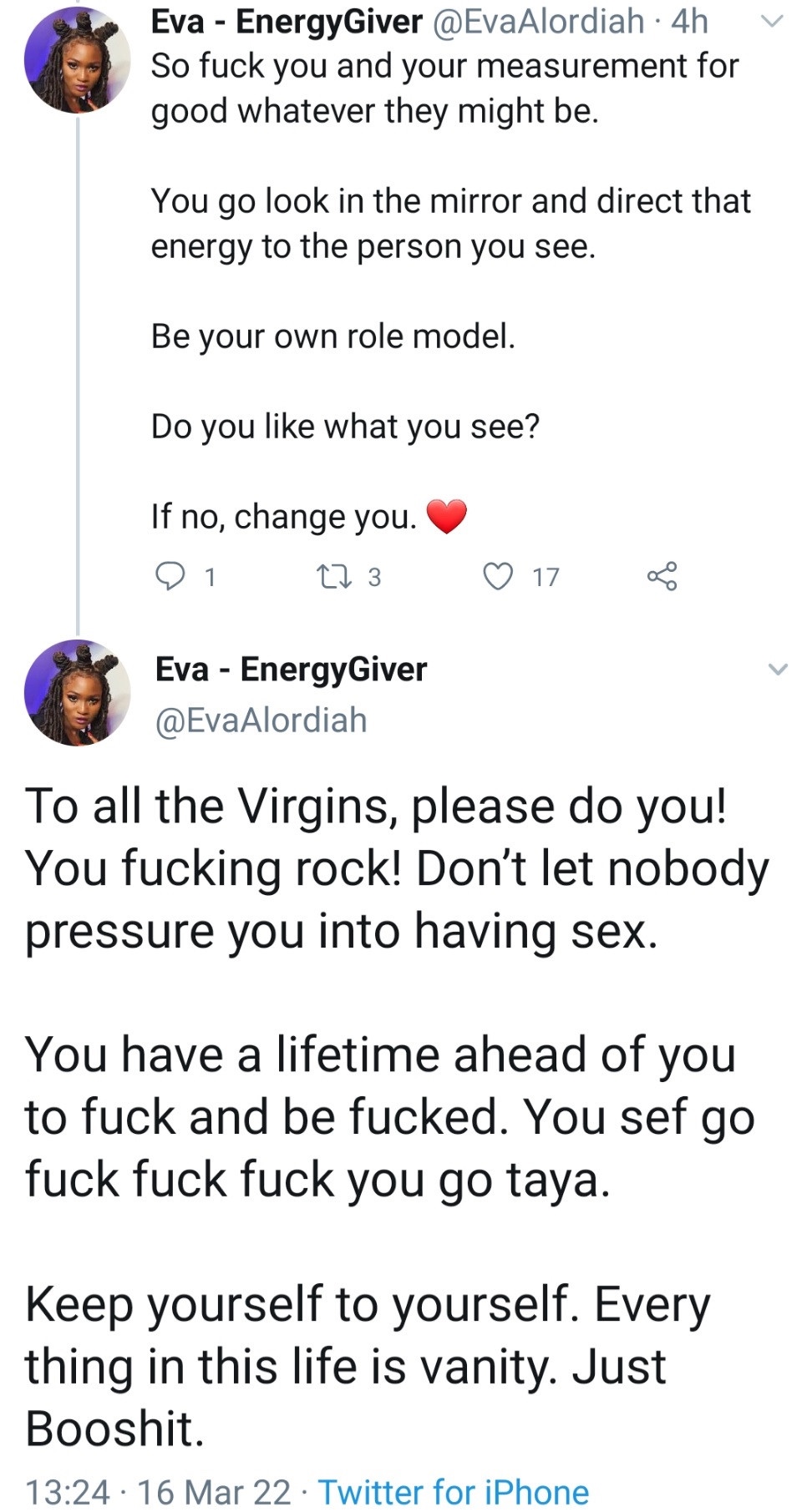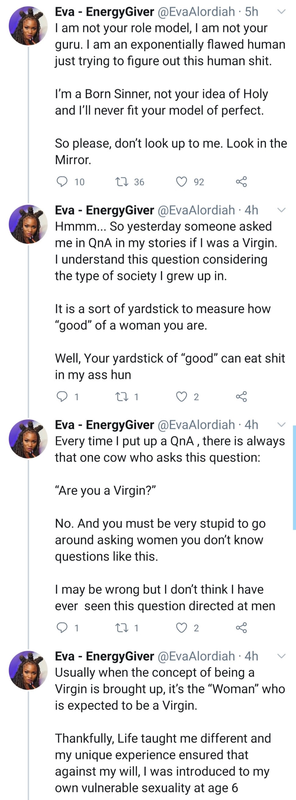 Eva Alordiah took to Instagram to point out how the “burden of virginity” and morality is placed on women alone.