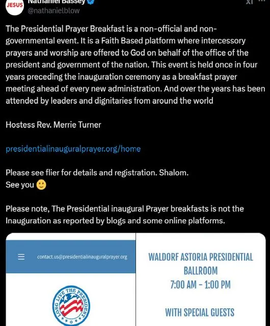 Bassey explained that the Presidential Prayer Breakfast, which was mentioned in the reports, is a non-official, non-governmental gathering, not directly tied to the inauguration. He emphasized that it is a faith-based event held every four years prior to the inauguration, focused on intercessory prayers and worship for the president-elect and the nation’s leadership.