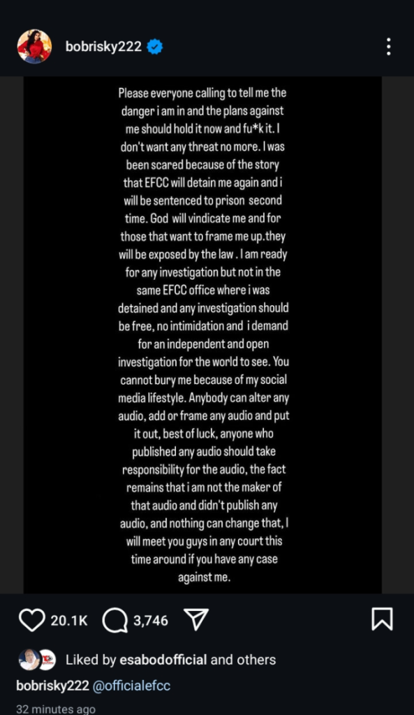 Bobrisky maintains innocence, denying involvement in alleged audio recordings.