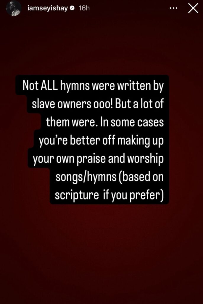 The singer questioned how anyone could feel “blessed and happy” singing hymns that were originally written by slave owners and forced on enslaved Africans during torture and dehumanization.