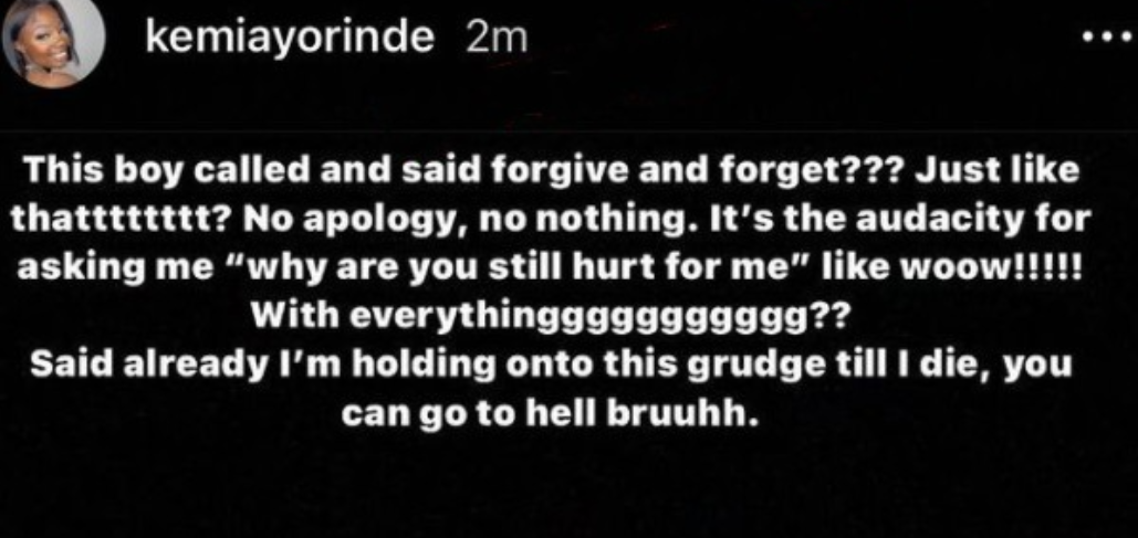 Questioning his audacity for making such a demand, the mother of one pointed out that no apology was offered. Kemi went on to say that she will hold the grudge she has against him till she dies.