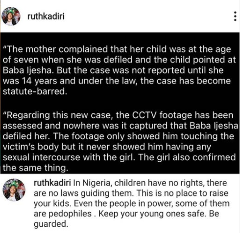 Actress Ruth Kadiri has reacted to reports that actor, Baba Ijesha, who has been accused of molesting a minor seven years ago, will be released on Friday, April 30. Reacting to the development via her Instagram page, Ruth wrote; A police source has said that the actor may be released due to the ongoing strike action by judicial workers. The police source said he will be released as it is against the law to hold him in custody without trial. The source also said no case of defilement has been established against the actor.