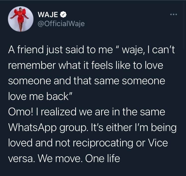 In a tweet she shared, Waje said it is either she is being loved and not reciprocating or vice versa. She further revealed that she came to this realization after a friend told her same.