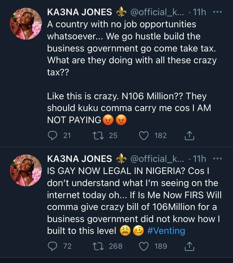The reality show star in her tweet, asked if homosexuality is now legal in the country. Claiming that she doesn’t understand what she’s seeing on the internet, Ka3na also alleged that the government always give outrageous tax to her businesses.