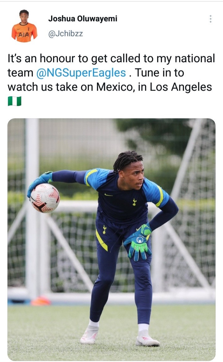 Tottenham Hotspurs goalkeeper, Joshua Oluwayemi is delighted to be invited by the Nigeria Football Federation for the friendly match against Mexico.