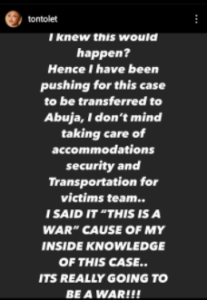 Reacting to the news of the soon release, Tonto took to Instagram and wrote what you are about to read below… WAR, WAR, WAR she says.