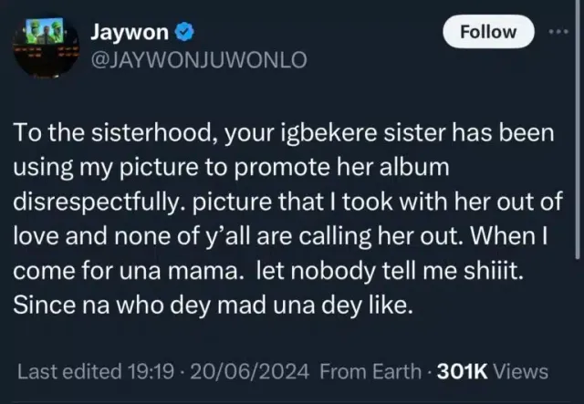 “To the sisterhood, your igbekere sister has been using my picture to promote her album disrespectfully. picture that I took with her out of love and none of y’all are calling her out. When I come for una mama. let nobody tell me shiiit. Since na who dey mad una dey like.”