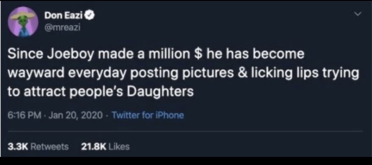 ”Since Joeboy made a million $ he has become wayward everyday posting pictures & licking lips trying to attract people’s Daughters”. He wrote