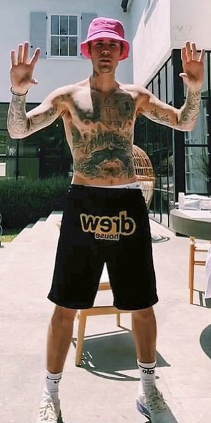 Though Bieber was sans shirt, he did don a pair of black basketball shorts from his clothing line Drew and a bright pink bucket hat.