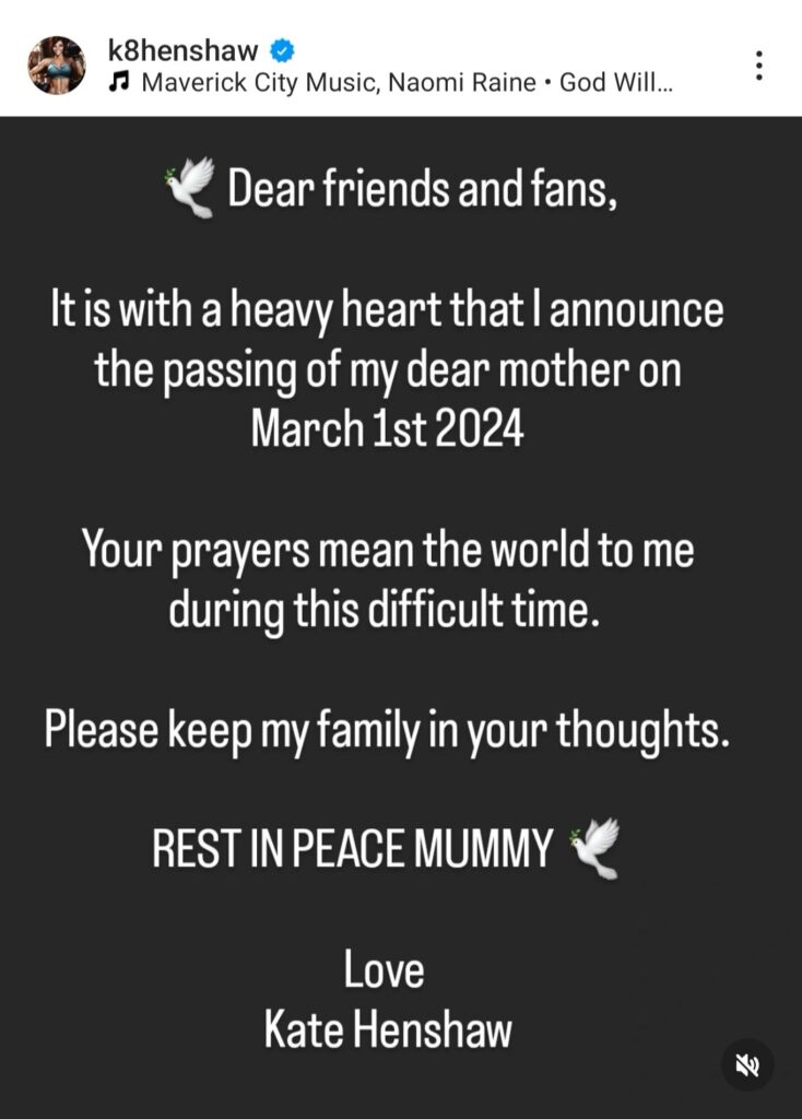 “It is with a heavy heart that I announce the passing of my dear mother on March 1st 2024