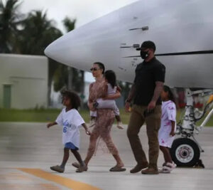 Kim and Kanye exited the plane with their four little ones (North, seven, Saint, four, Chicago, two, Psalm, one) on Sunday.