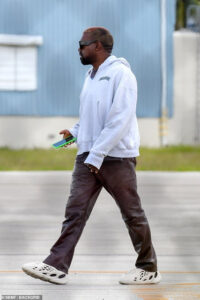 Kanye was keeping it casual with a grey sweatshirt and brown trousers as they arrived in Florida.