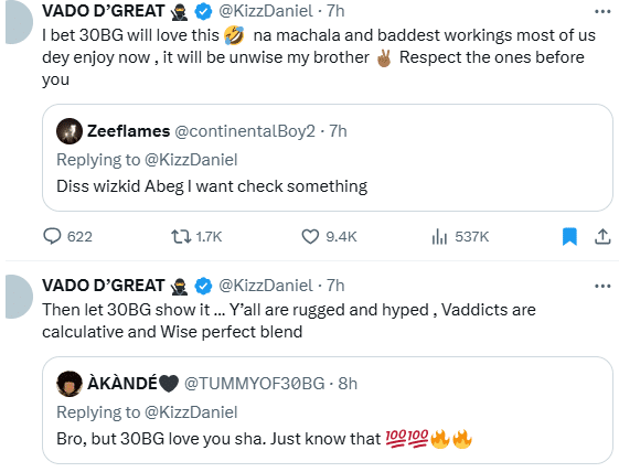 Kizz Daniel responded, encouraging fans to show their love tangibly: “Then let 30BG show it… Y’all are rugged and hyped, Vaddicts are calculative and wise, perfect blend.”
