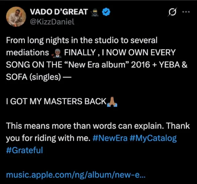 By reclaiming the masters to New Era, Kizz Daniel now has full control over the creative and commercial rights to the album and related singles, meaning he will directly benefit from any future use, licensing, or revenue generated by the tracks.