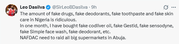 “The amount of fake drugs, fake deodorants, fake toothpaste and fake skin care in Nigeria is ridiculous. In one month, I have bought fake codliver oil, fake Gestid, fake sensodyne, fake Simple face wash, fake deodorant, etc. NAFDAC need to raid all big supermarkets in Abuja,” he wrote.