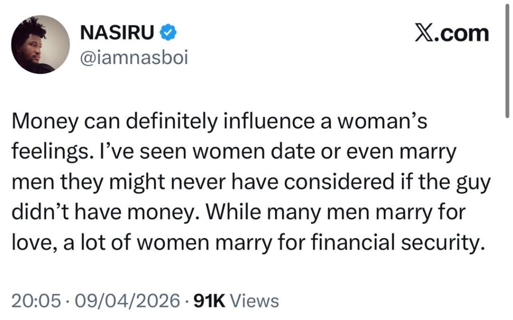 In a post shared on his X handle, Nasboi opined that many men marry for love while a lot of women marry for financial security.