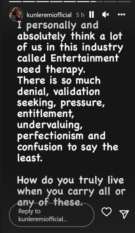 Actor Kunle Remi has said that many stakeholders in the entertainment industry need therapy.