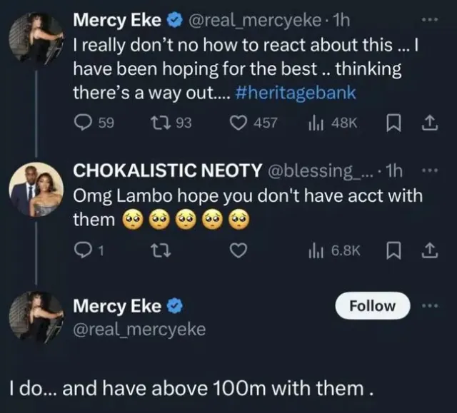 BBNaija Season 4 winner, Mercy Eke has lamented the closure of Heritage Bank, saying she has over N100M with the bank, and now confused over their sudden shutdown.