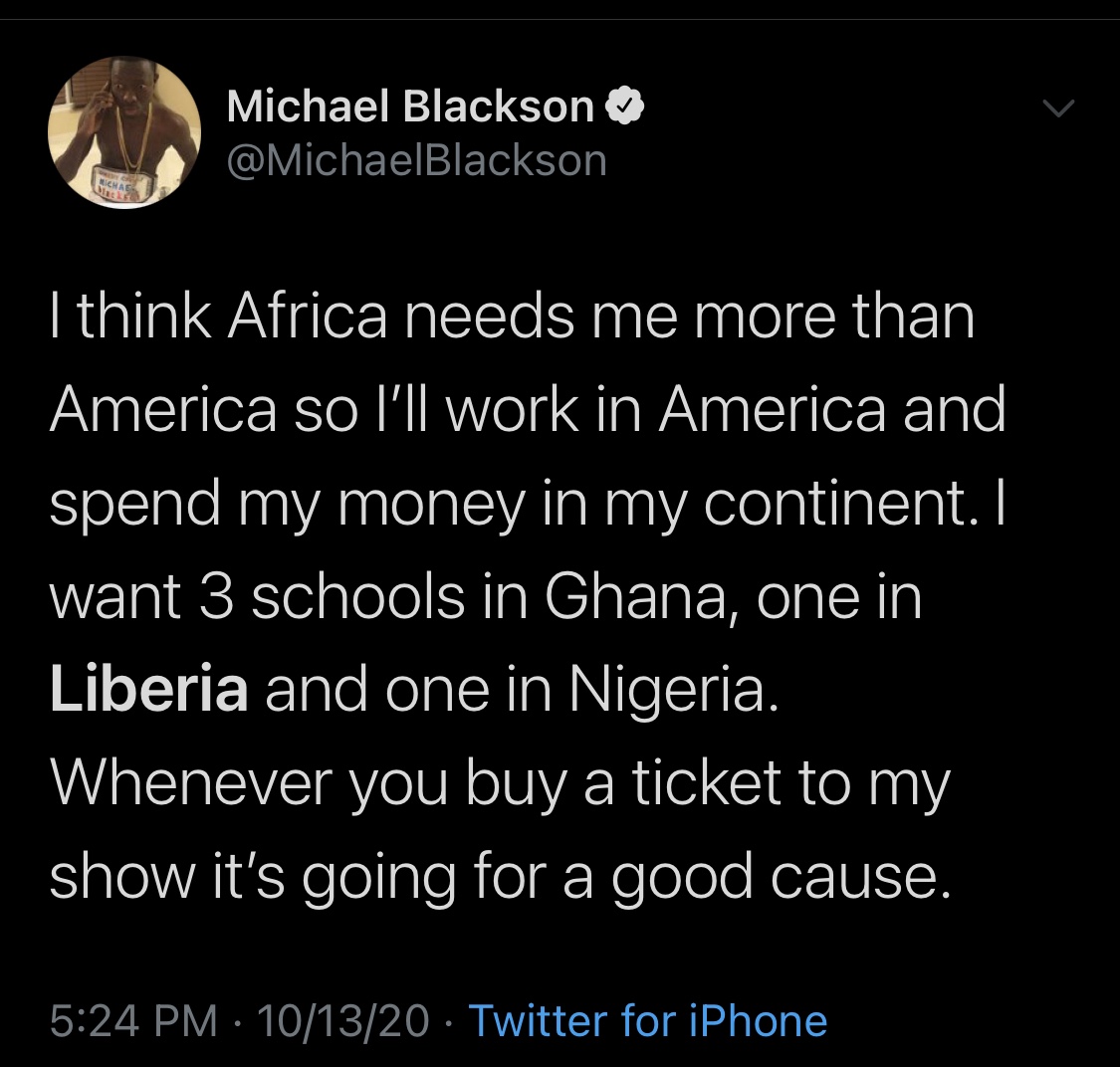 American based , Ghanaian- Liberian actor and comedian took to his Twitter page earlier today to state that he is intending to build a school in Ghana , Liberia and Nigeria .