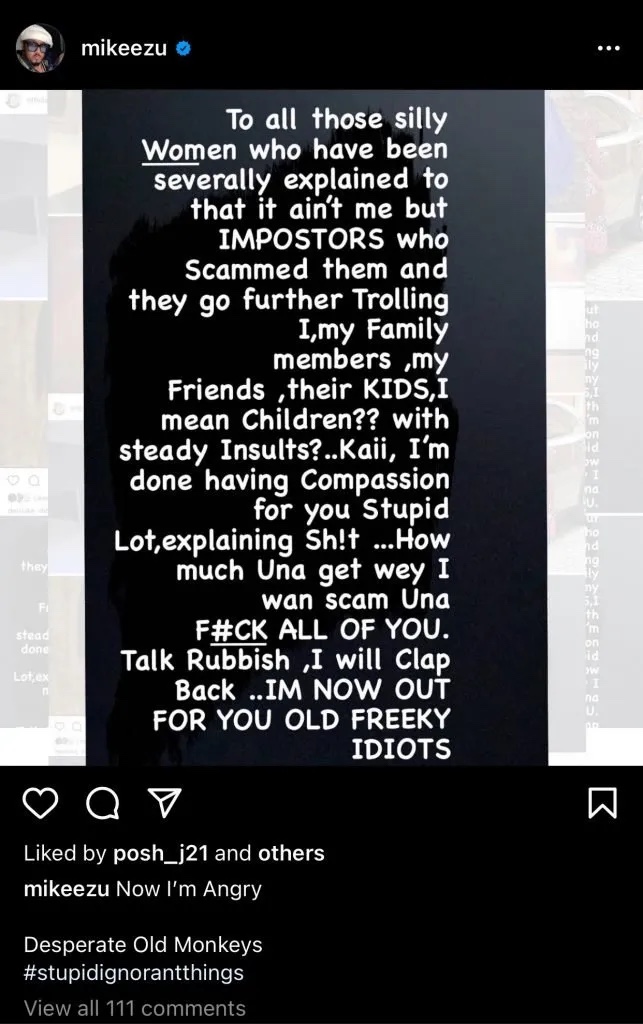 “Now I’m angry, to all those silly women who have been severally explained to that it ain’t me but impostors who scammed them and they go further trolling I, my family members, my friends, their KIds, I mean children, with steady insults,” he said.