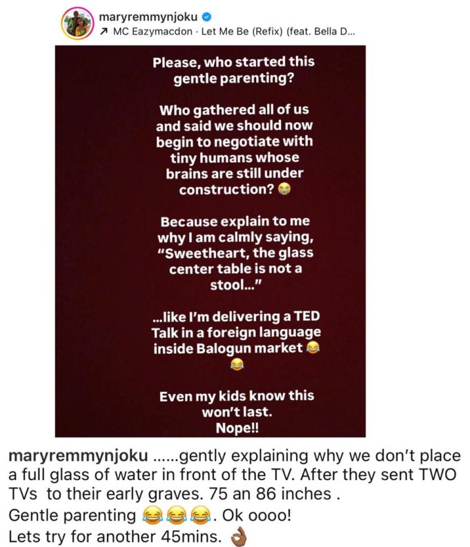 “Please, who started this gentle parenting?. Who gathered all of us and said we should now begin to negotiate with tiny humans whose brains are still under construction?. Because explain to me why lam calmly saying, “Sweetheart, the glass center table is not a stool……like I’m delivering a TED. Talk in a foreign language inside Balogun market. Even my kids know this won’t last. Nope!!,” she stated.