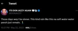 ”Those days wey I be sinner. This kind rain like this na soft water water yansh just remain.”