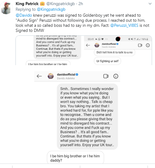 A music producer and CEO of GoldenBoy Entertainment, King Patrick has dragged Davido and Peruzzi to court for breach of contract. He says while the case is still pending in court, he also wants twitter users to know about it.