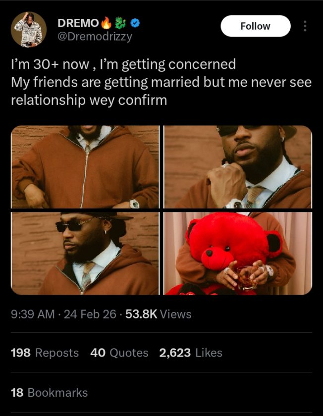 Rapper, Dremo has opened up about his feelings on being single at 32, sharing his thoughts with fans on social media