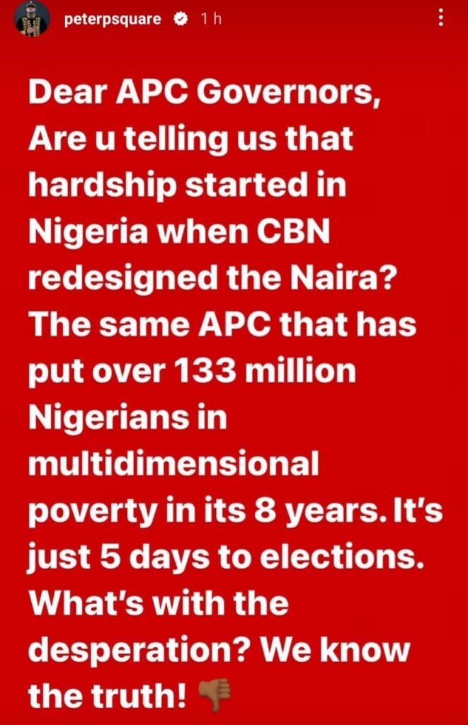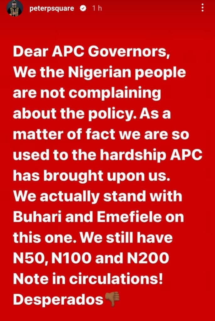 In a series of posts shared on Instastories, Peter stated that the governors should stop complaining because Nigerians are not complaining about the policy. He claimed that Nigerians are used to the hardship inflicted on them by the APC government and are in support of the Naira swap policy despite the attendant hardship that has accompanied it.