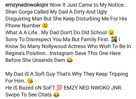 Ned’s Nwoko’s alleged son has claimed Nollywood actress Shan George has been in his DM begging for his dad’s number. According to the alleged Nwoko Jr, he just got to know, Shan called his dad dirty, ugly disgusting man for marrying younger actress, Regina Daniels and he decided to leak their chats. Below is what he wrote alongside the leaked chats.