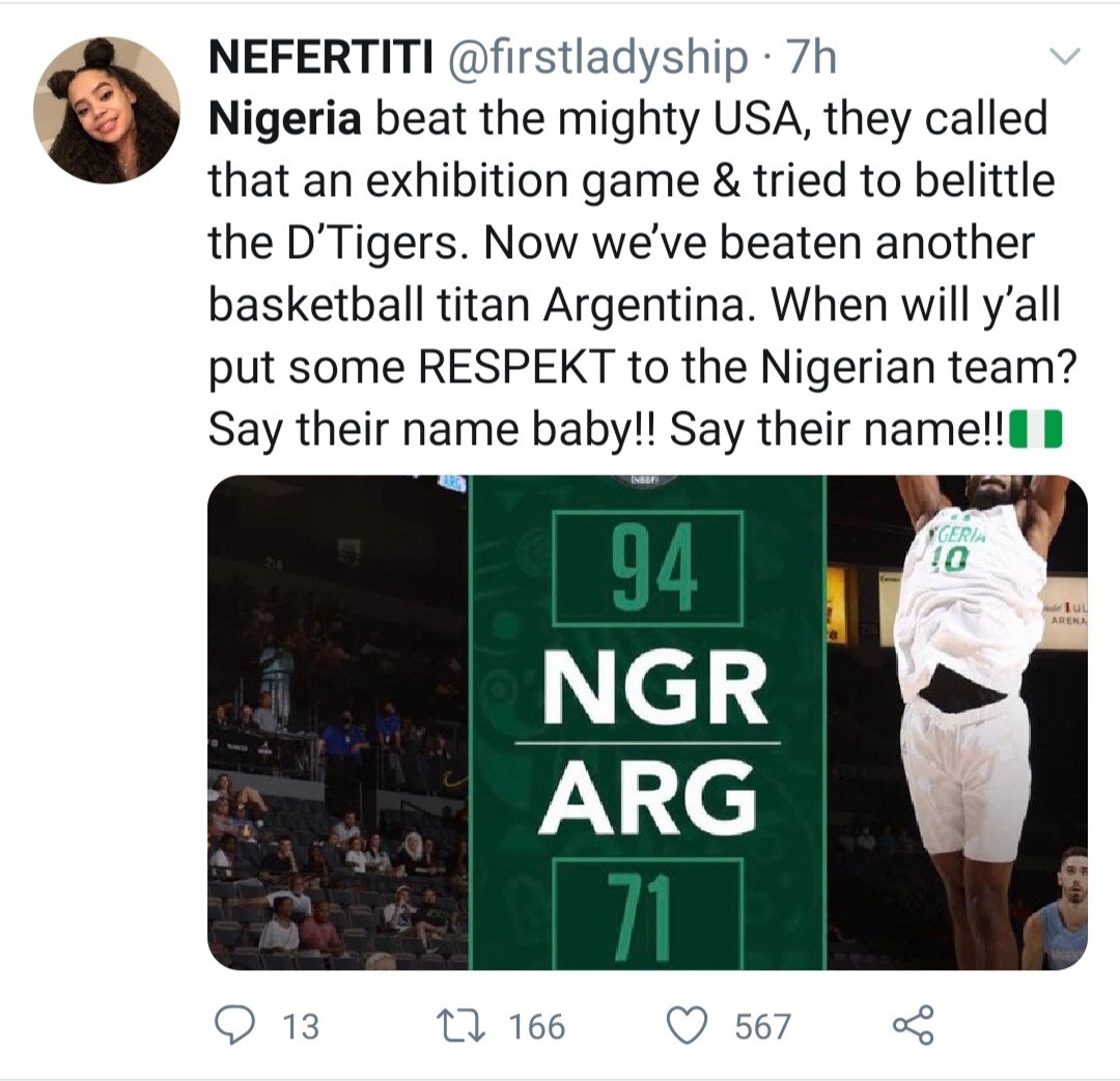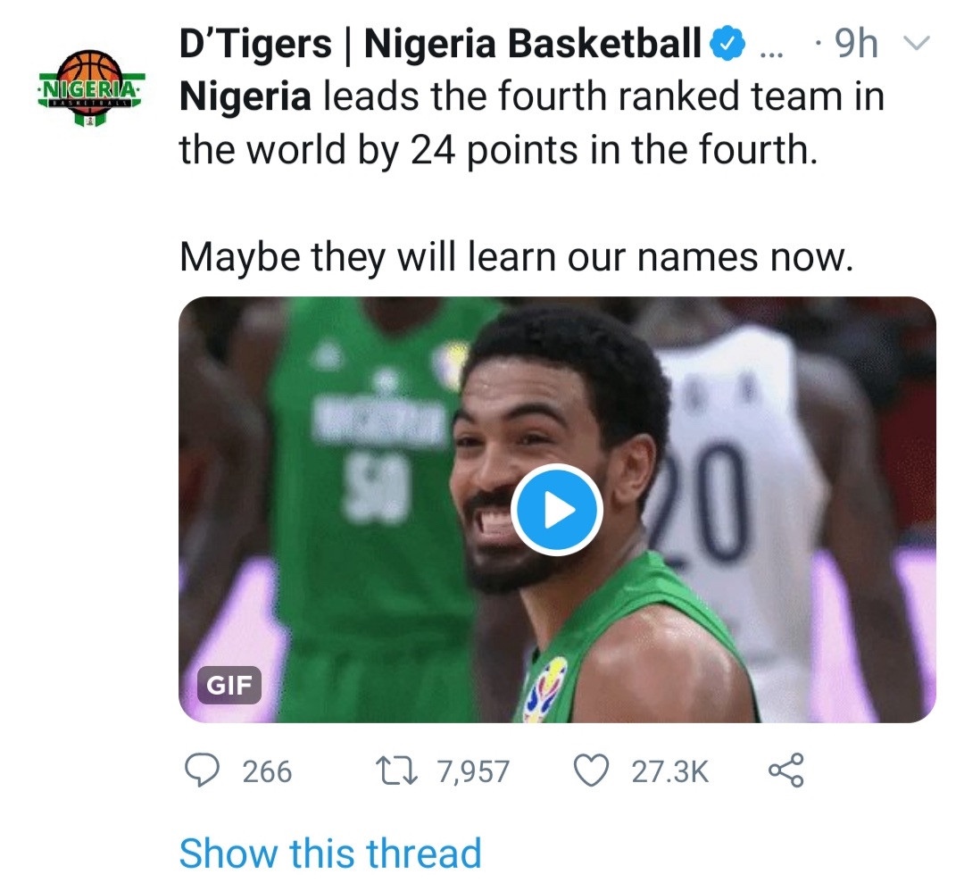 Nigerians on Twitter are celebrating that after besting the USA – the FIBA-ranked No.1 team – D’Tigers followed up that victory with another eye-catching win over the No.4-ranked Argentines.