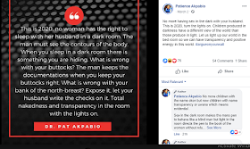 ”No more having sex in the dark with your husband. This is 2020, turn the lights on. Children produced in darkness have a different view of the world than those produced in light. Let us light up our world in the bedroom so we can have transparency and positive energy in this world