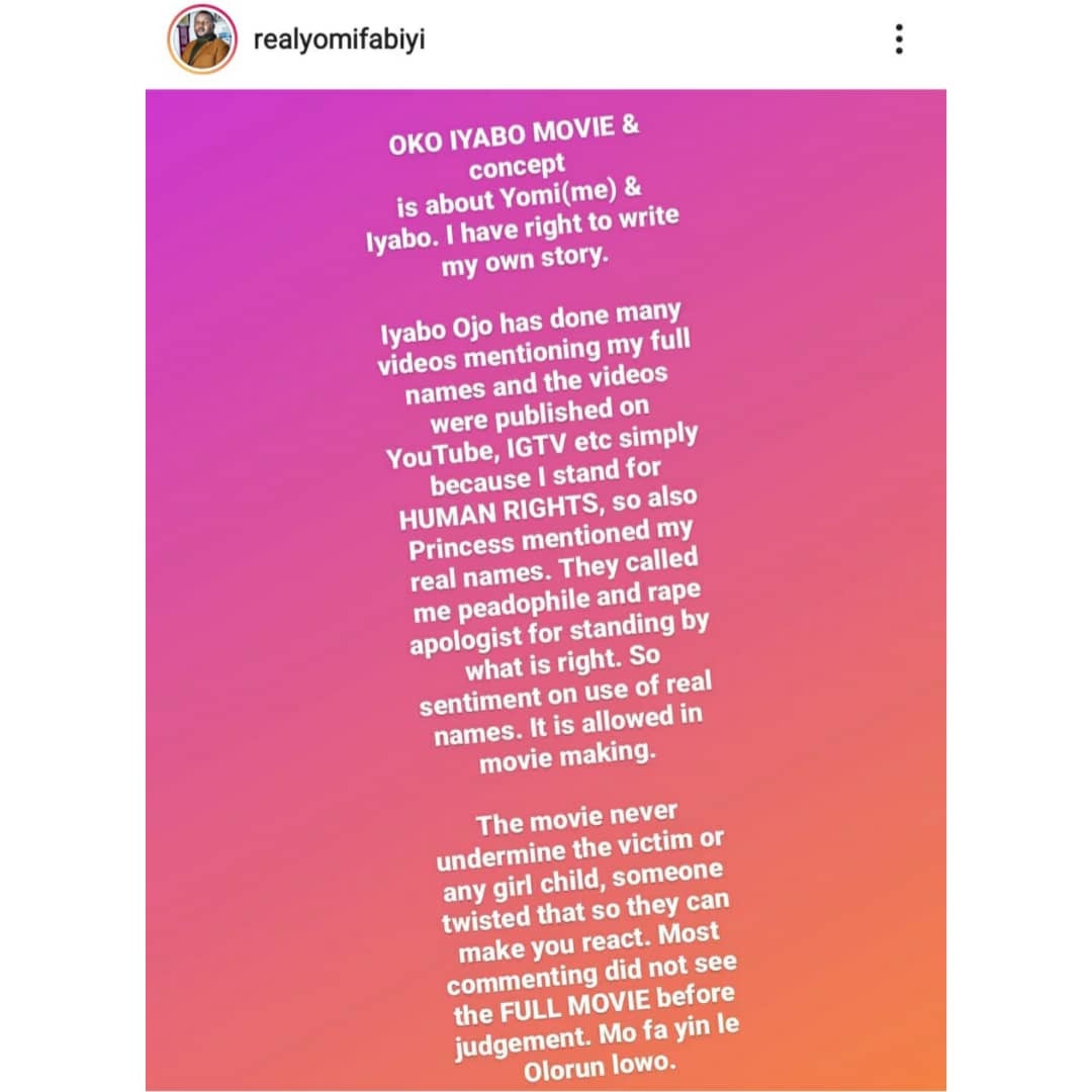 He admitted that the movie is about him and ‘Iyabo’, adding that he has a right to his own story. He claims he never undermined the victim or any girl child and that someone ‘twisted’ it so as to get reactions from the public.