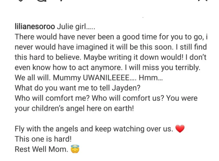 Popular Nollywood actress, Lilian Esoro, has announced the passing of her mother.