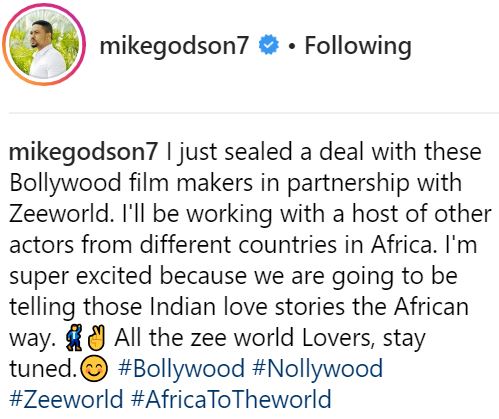 He wrote: “I just sealed a deal with these Bollywood film makers in partnership with Zeeworld. I’ll be working with a host of other actors from different countries in Africa.