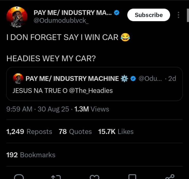 “I DON FORGET SAY I WIN CAR 😂 HEADIES WEY MY CAR?”.