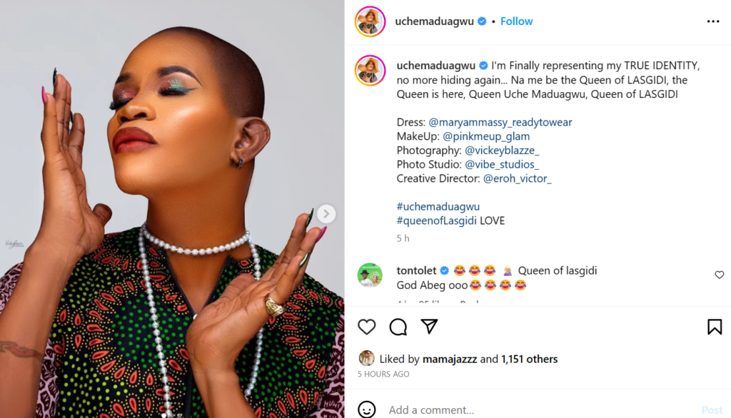 “I’m Finally representing my TRUE IDENTITY, no more hiding again… Na me be the Queen of LASGIDI, the Queen is here, Queen Uche Maduagwu, Queen of LASGIDI”