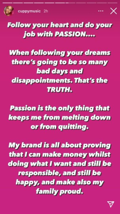 Nigerian singer and DJ, Cuppy has admitted that she would have quit music a long time ago, but her passion has kept her strong all this while and still keeps her going. Cuppy revealed this via her Instagram stories on Friday, the 28th of May 2021. Encouraging people who are currently in a bad place, Cuppy said that disappointments and bad day are a norm for people chasing their dreams. She implored people to always follow their heart, citing passion as the only thing that has kept her from quitting music. She writes;