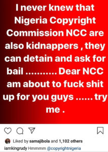 “I never knew that Nigeria Copyright Commission NCC are also kidnappers, they can detain and ask for bail… Dear NCC am about to fk st up for you guys… try me. (sic)” Paul wrote in a now-deleted-post.