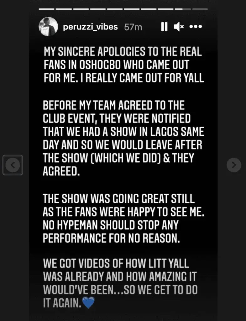 Few hours later, Peruzzi took to Instagram again to apologize. He apologized for his behavior, for disappointing and disrespecting his Osogbo fans.