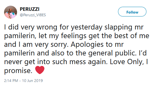 Perruzi has apologized for slapping social media influencer Pamilerin yesterday in Balyelsa. He made his apology public shortly after his boss, Davido publicly apologized to the young man. What Peruzzi wrote;
