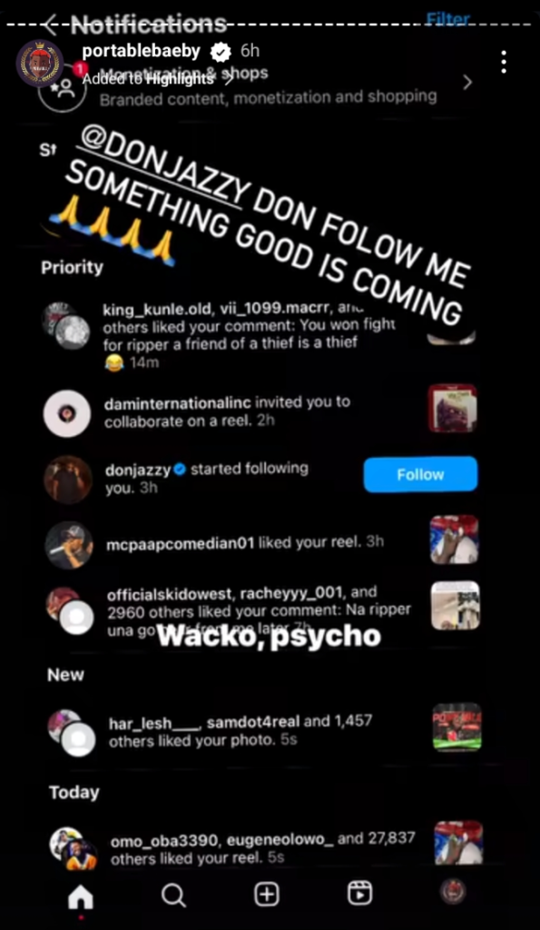 Portable, known for his energetic and catchy tunes, shared a screenshot of Don Jazzy’s follow on his Instagram page, accompanied by an enthusiastic caption: