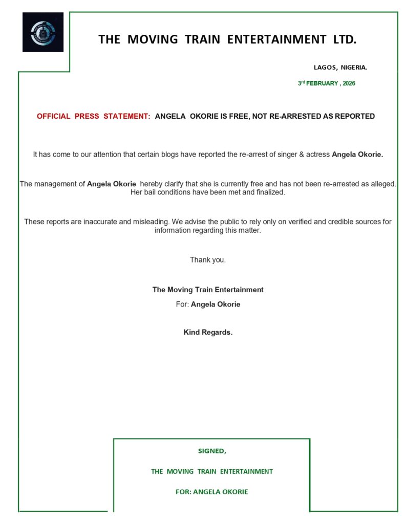 We hereby clarify that Angela Okorie is currently free and has not been re-arrested as alleged. Her bail conditions have been met and finalized.