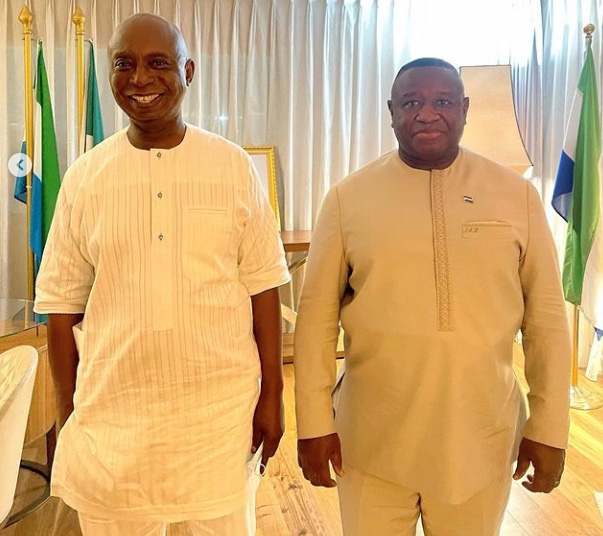 Regina Danielss joins her husband, Ned Nwoko to meet the President of Sierra Leone
