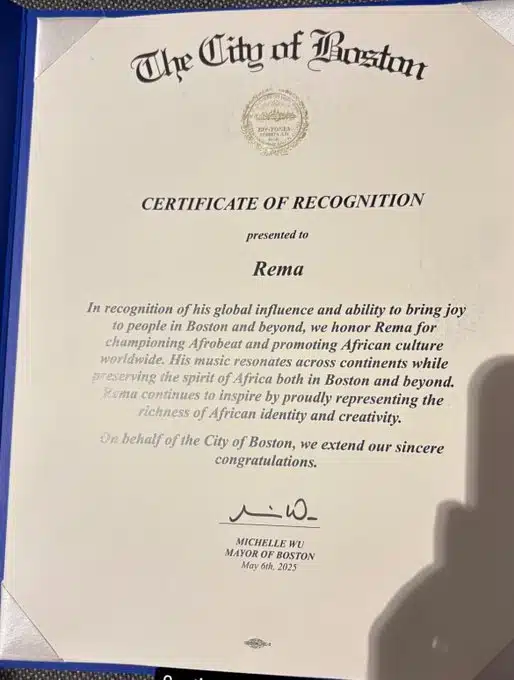 “In recognition of his global influence and ability to bring joy to people in Boston and beyond, we honor Rema for championing Afrobeat and promoting African culture worldwide. His music resonates across continents while preserving the spirit of Africa both in Boston and beyond, Rema continues to inspire by proudly representing the richness of African identity and creativity. On behalf of the City of Boston, we extend our sincere congratulations.”