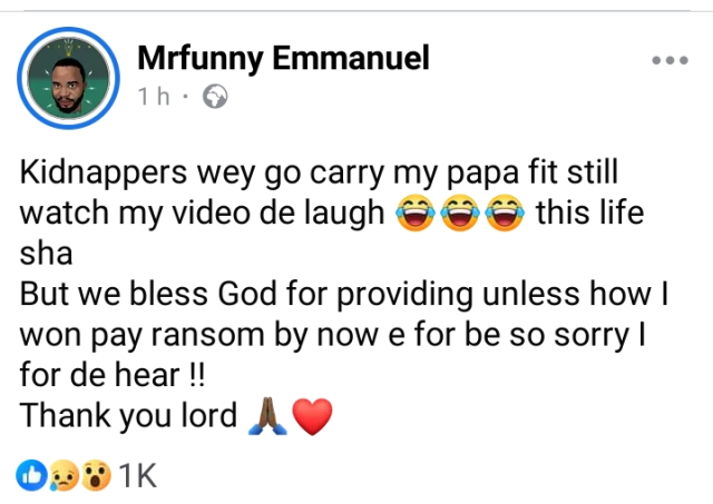 Despite the distressing situation, he chipped in humor by stating the possibility of the kidnappers laughing at his skits and expression of gratitude for being able to pay the ransom, writing: