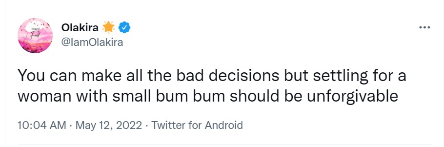 Immediately he made the tweet, most women came for him asking what should happen to ladies with small butts, lol.
