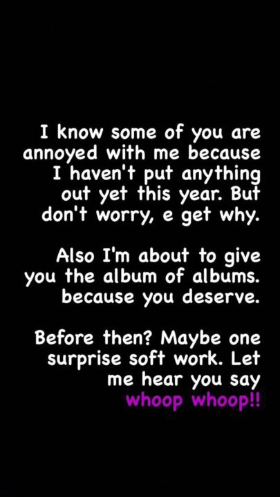 I know some of you are annoyed with me because I haven’t put anything out this year. But don’t worry, e get why. Also, I’m about to give you the album of albums. because you deserve. Before then? Maybe one surprise soft work. Let me hear you say whoop whoop!!